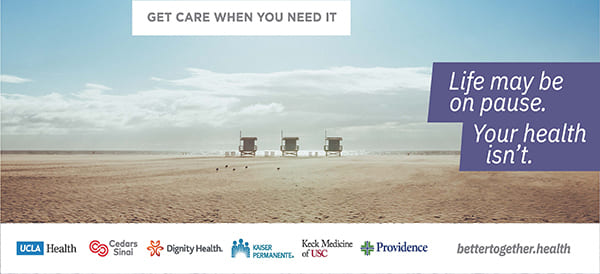 UCLA Health加州大学洛杉矶分校医疗中心(UCLA Health),普罗维登斯(Providence),南加州大学凯克医疗中心(Keck Medicine of USC),凯萨医疗机构(Kaiser Permanente),西部天主教医护(Dignity Health)和西达赛奈(Cedars-Sinai)联手共同创办了Better Together.Health“生活暂停,健康永续”的教育活动。